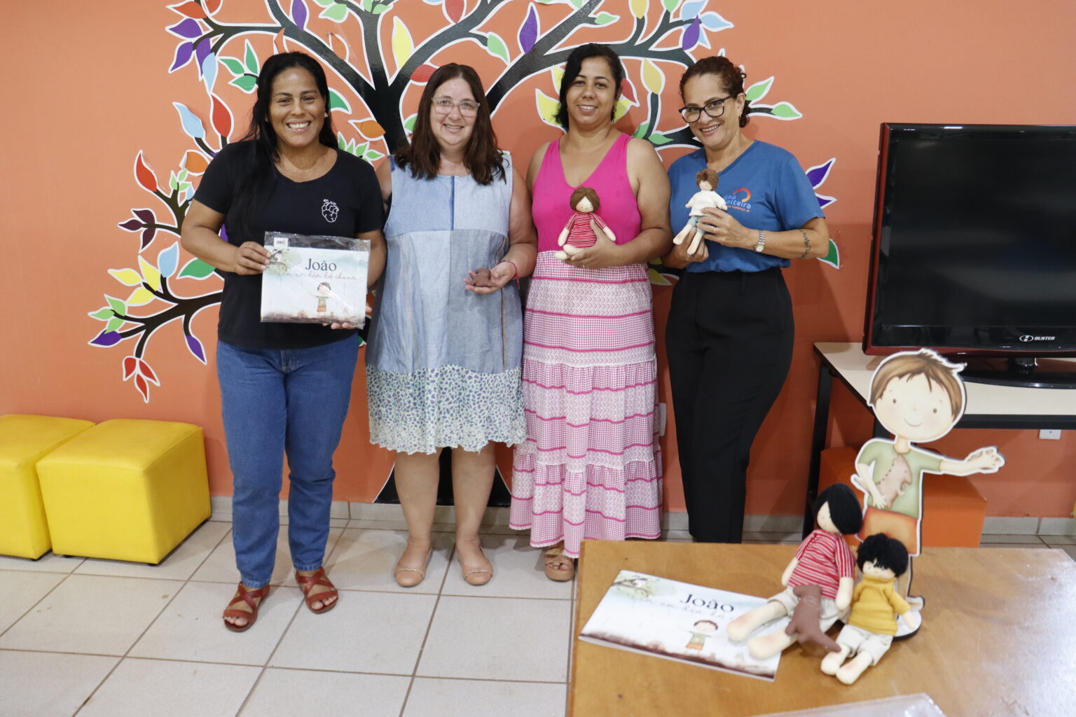 A obra foi recebida por Fabiana Alves dos Santos, Diretora de Cultura, e por Mara Lopes, Eliana dos Santos e Rafaela de Souza, funcionárias da Biblioteca. O livro, intitulado “João em um Dia de Chuva”, ganha vida de maneira lúdica por meio dos bonecos confeccionados por Daniela, que se define como “bonequeira”, transformando tecidos em sonhos. As peças foram desenvolvidas a partir dos moldes criados no Atelier Coração de Pano, espaço idealizado por Alain Carlson e sua esposa, a designer de bonecas Day, dedicado à criação e ensino dessa arte manual.