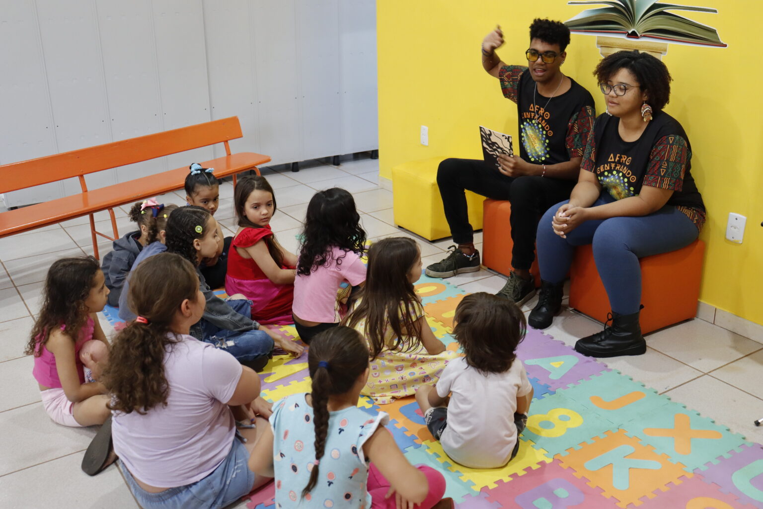 Durante a leitura, os participantes acompanharam a trajetória de Kaya, uma menina que, por não encontrar referências em sua própria história, passa a desconhecer a beleza de suas raízes africanas. Ao longo da atividade, a narrativa abriu espaço para reflexões sobre identidade, pertencimento e a importância da representatividade.